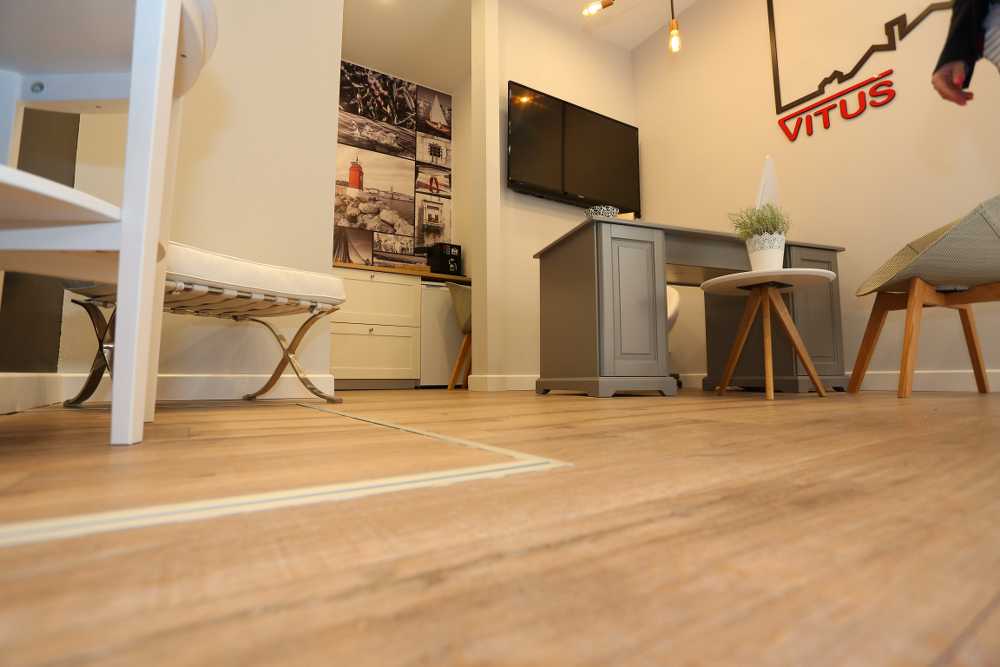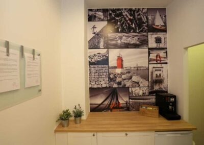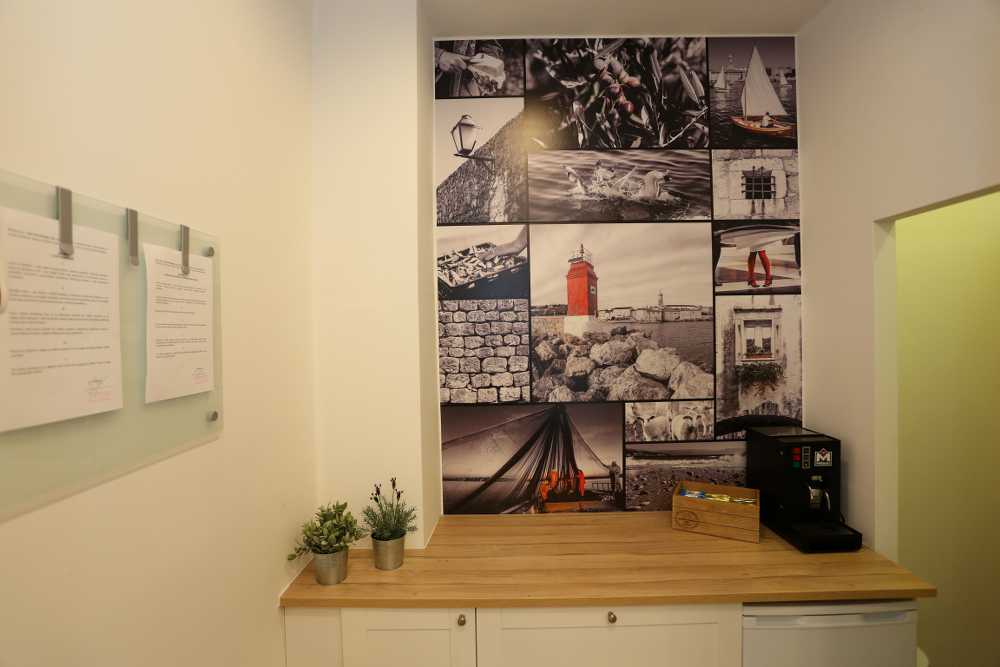 Prvo smo odlučili zamjeniti stara dotrajala vrata novima drvenim u sivoj boji, sa što više staklene površine, kako bi dobili efekt izloga. Sljedeći korak bio je nadozid zatečenog pregradnog zida, nivelacija poda, te postavljanje laminata (izvrsna replika seljačkog poda), farbanje zidova… Dok nismo došli do konačnog rezultata.